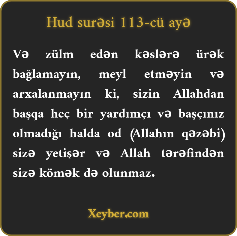 “Zülmkarlara meyl etməyin, onlara sığınmayın. (Əzab alovu) sizi də