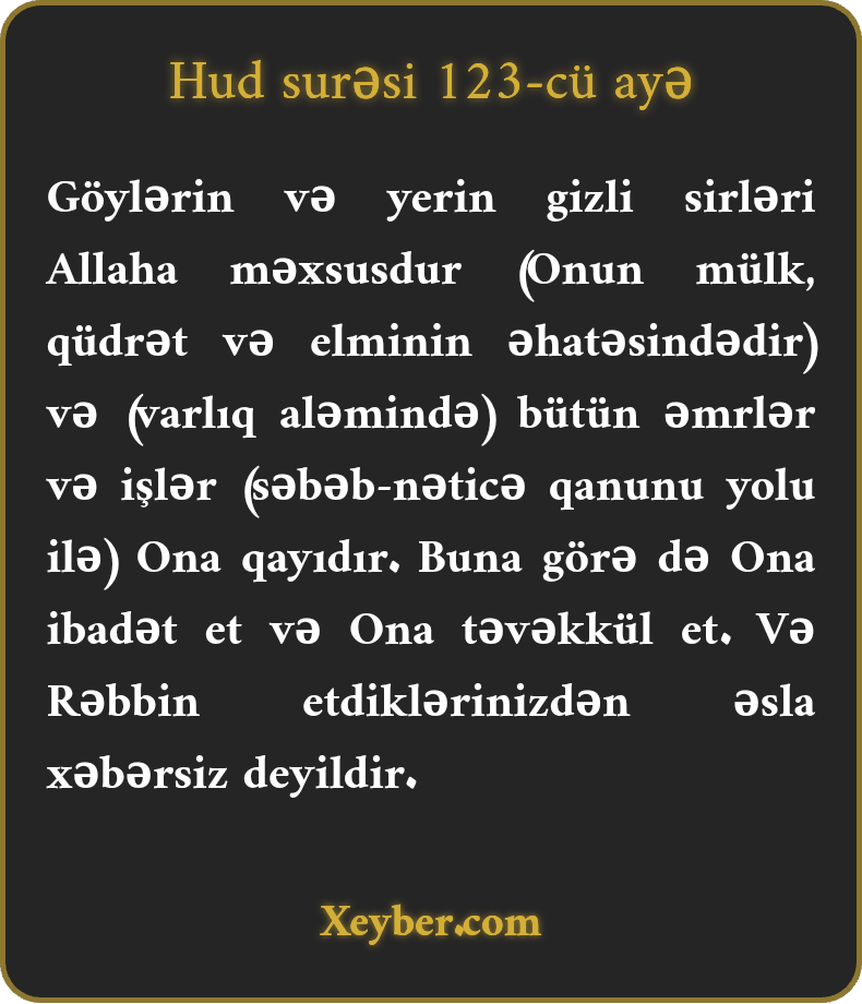 “Göylərin və yerin sirri yalnız Allah üçündür. Bütün işlər Ona doğru