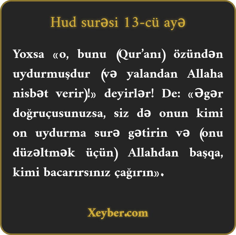 "Ya da deyirlər: "O, Quranı özündən düzəltmişdir.” De ki, əgər doğru deyirsinizsə, siz də özünüzdən on surə düzəldib gətirin. (Bu işdən ötrü) hər kəs Allahdan qeyri istədiyini (köməyə) çağırsın.”