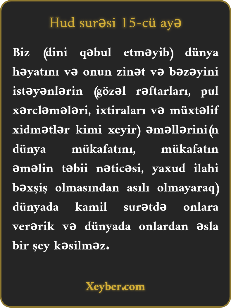 "Dünya və ondakı gözəllikləri istəyənlərə əməllərinin əvəzini həmin bu dünyada tam verərik. Onda heç bir əskiklik olmayacaq.”