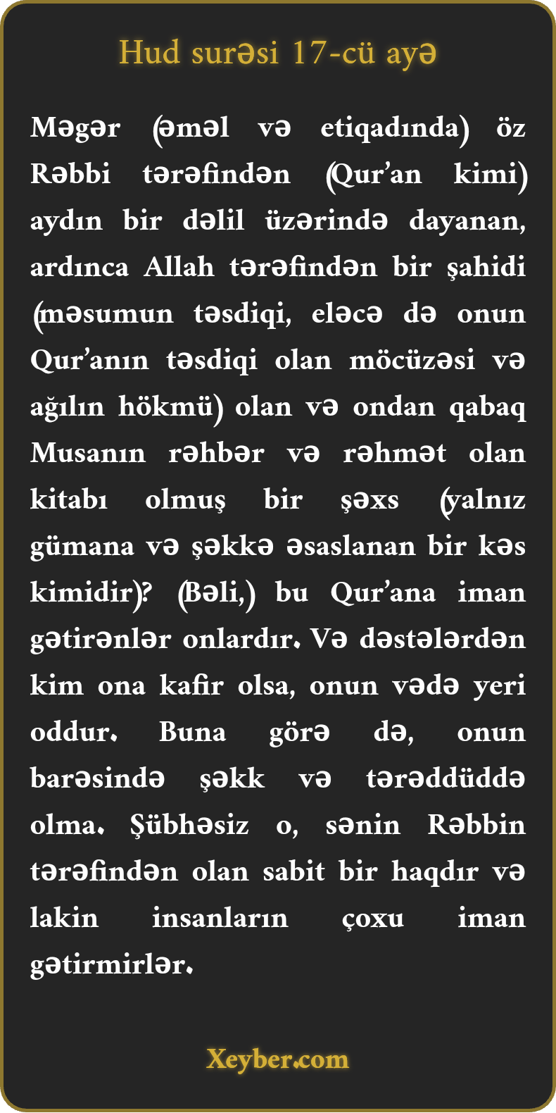"Rəbbi tərəfindən aşkar dəlili olan, ardınca Ondan (Allahdan) bir şahid gələn, bundan öncə Musanın kitabı rəhbər və rəhmət olmuş (həmin kitabda gəlişi müjdə verilmiş kimsə başqaları kimi ola bilərmi?”) Onlar (haqpərəstlər) ona iman gətirər. Onu inkar edən dəstədən olan kəsin yeri oddur. Ondan sonra tərəddüddə olma. Şübhəsiz, o (vəhy), xalqın əksəri iman gətirməsə də, Rəbbin tərəfindən gəlmiş bir haqdır.”