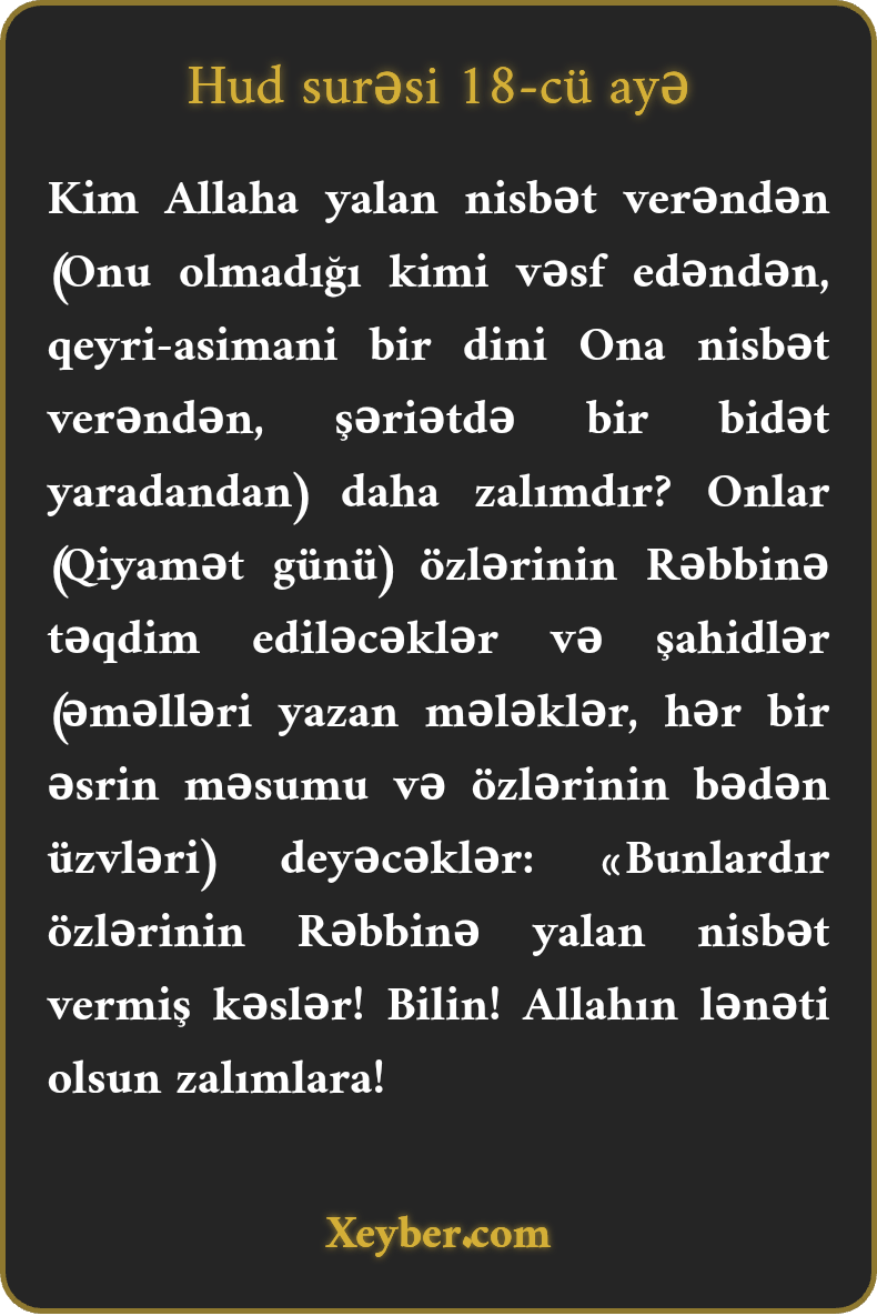 "Allaha iftira yaxandan da zalım kimdir? Onlar (qiyamətdə) Rəblərinə tapşırılarlar. Şahidlər deyəcəklər: "Bunlar Rəblərinə iftira yaxan kəslərdir.” Bilin ki, zalımlar Allahın lənətinə gələrlər.”