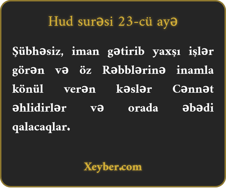 "Həqiqətən, iman gətirib saleh işlər görənlər, Rəbləri qarşısında təvazökar olanlar behişt əhlidirlər. Onlar orada həmişəlik olaraq qalacaqlar.”