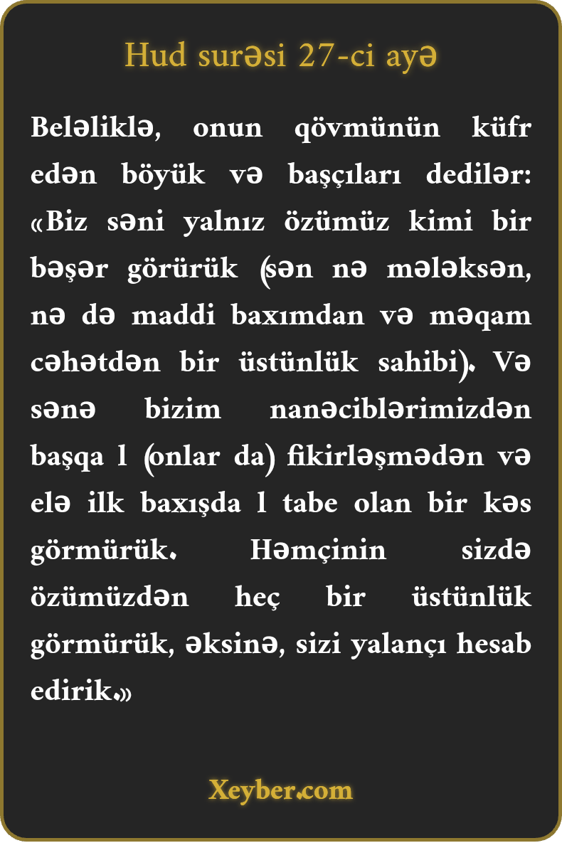 "Onun qövmünün kafir başçıları dedilər: "Biz səni yalnız özümüz kimi bir insan bilirik. Sadəlövh səfillərdən başqa kimsənin sənə itaət etdiyini görmürük. Sizdə özümüzlə müqayisədə heç bir üstünlük görmür, sizi yalançı sayırıq.”