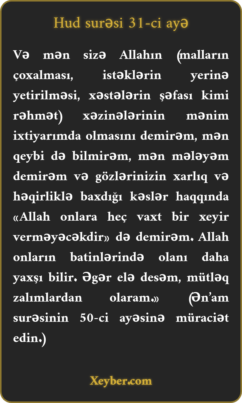 "(Nuh dedi:) "Mən sizə demirəm ki, ilahi xəzinələr məndədir və qeybi bilirəm. Demirəm ki, mən mələyəm, demirəm ki, sizin gözünüzdə xar olanlara Allah heç bir xeyir verməyəcək. Allah onların qəlbində olandan daha çox agahdır. (Bundan artıq bir şey desəm) şübhəsiz, zalımlardan olacağam.”