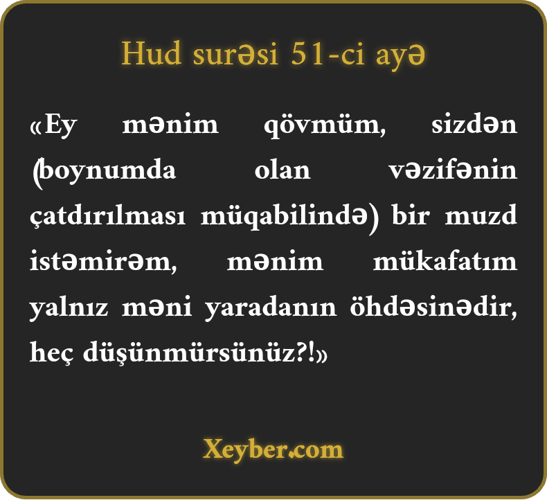 “(Hud dedi) Ey mənim qövmüm! Mən öz risalətim müqabilində sizdən