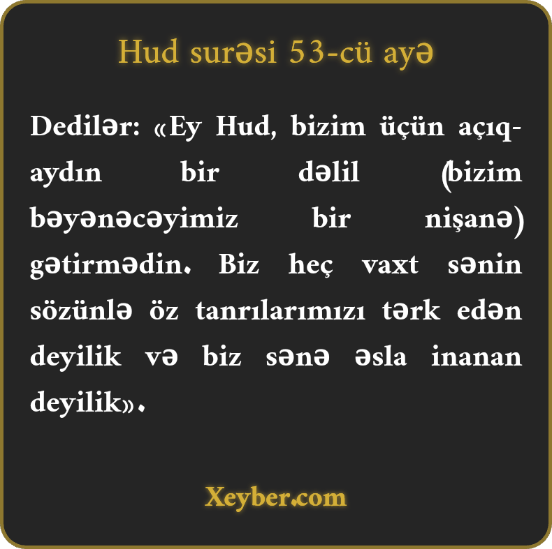 “(Müşriklər) dedilər: “Ey Hud! Sən bizim üçün aşkar dəlil gətirməmisən