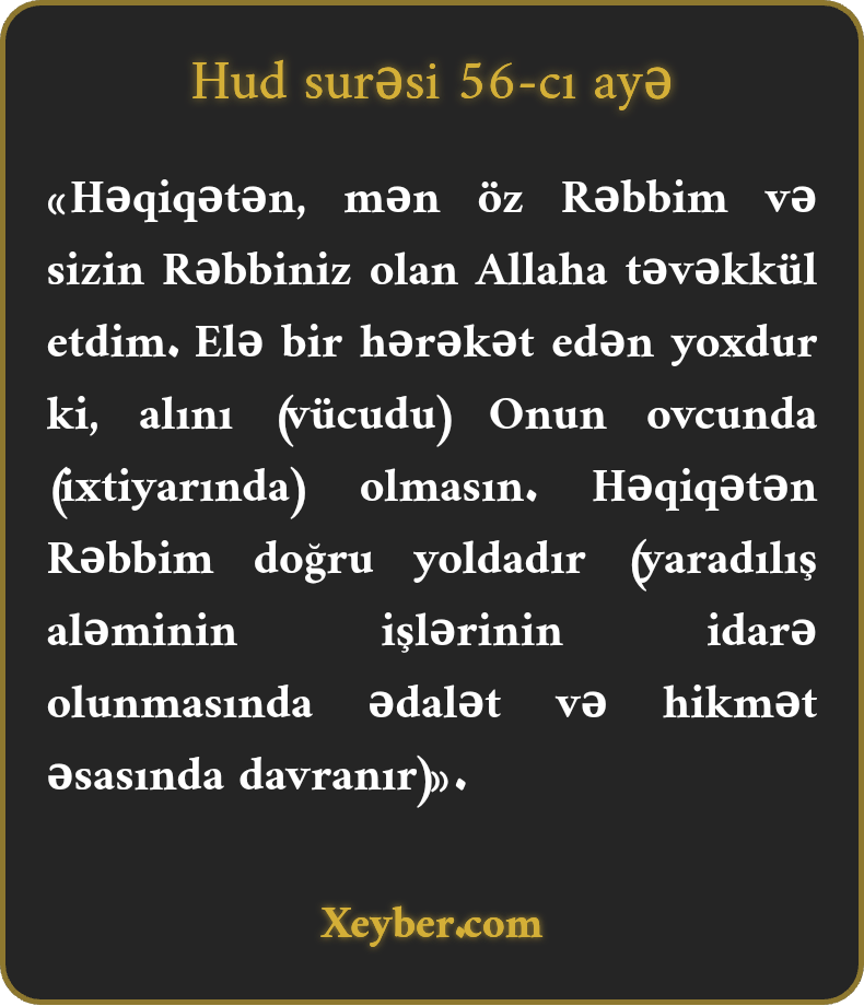 “Həqiqətən, mən mənim və sizin Rəbbiniz olan Allaha təvəkkül etmişəm.
