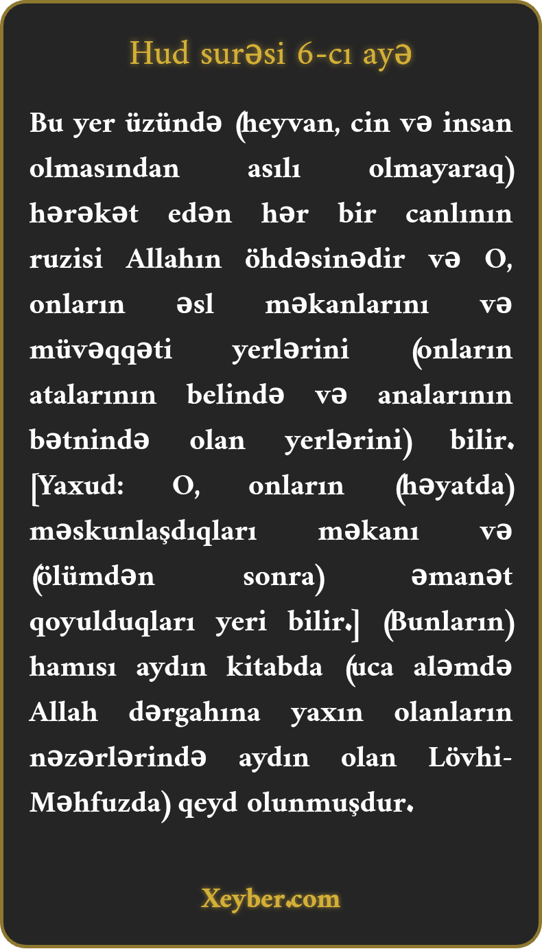 "Yer üzündə elə bir canlı yoxdur ki, Allah onun ruzisini verməsin. O, daimi və müvəqqəti yerləri bilir. Hər biri aşkar kitabda qeydə alınmışdır.”
