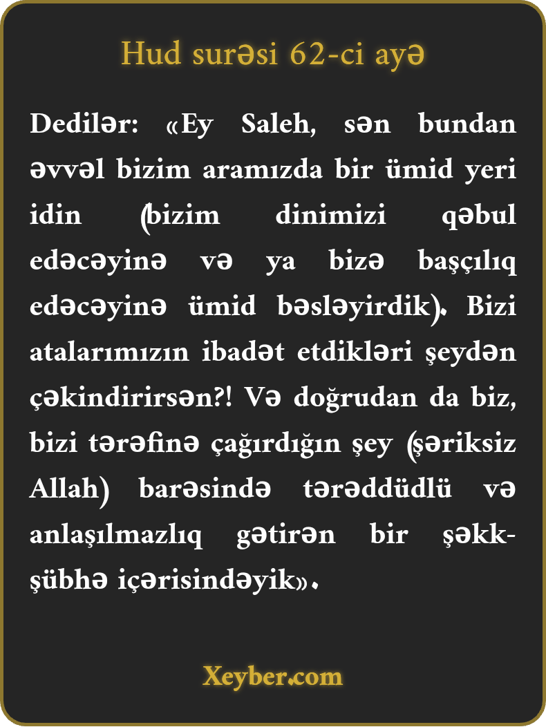 aramızda ümid yeri idin. İndi bizə atalarımızın pərəstiş etdiklərinə pərəstiş