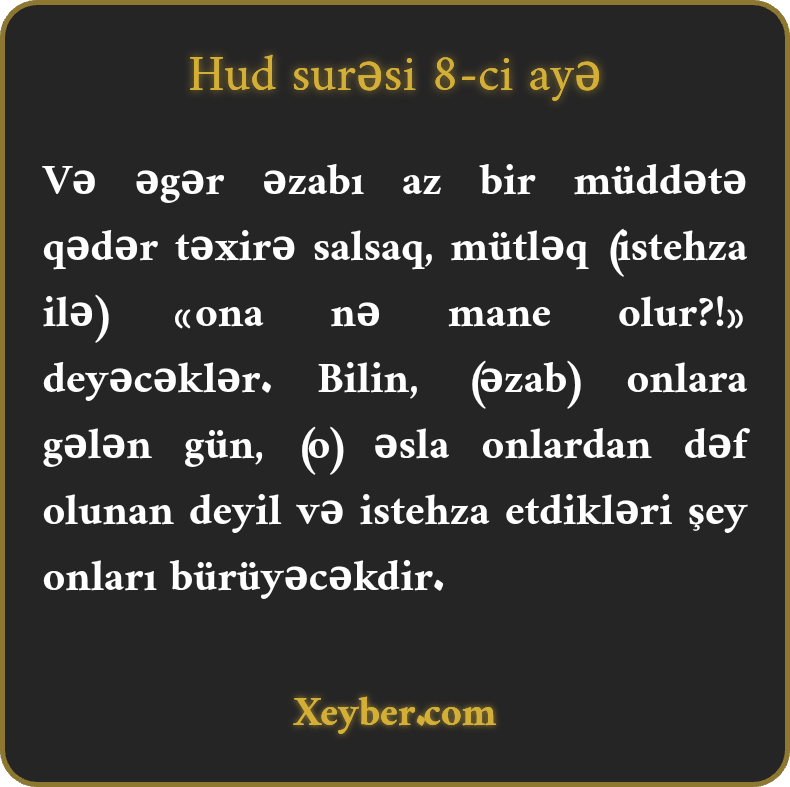 "Əgər əzabı məhdud bir müddət onların üzərindən götürsək, (məsxərə ilə) deyərlər: "Bizə əzabın qarşısını hansı əməl aldı?" Bilin ki, qəhr və əzabımız onların sorağına gələn gün geri götürülməz. Məsxərə etdikləri şey onları yaxalayar.”