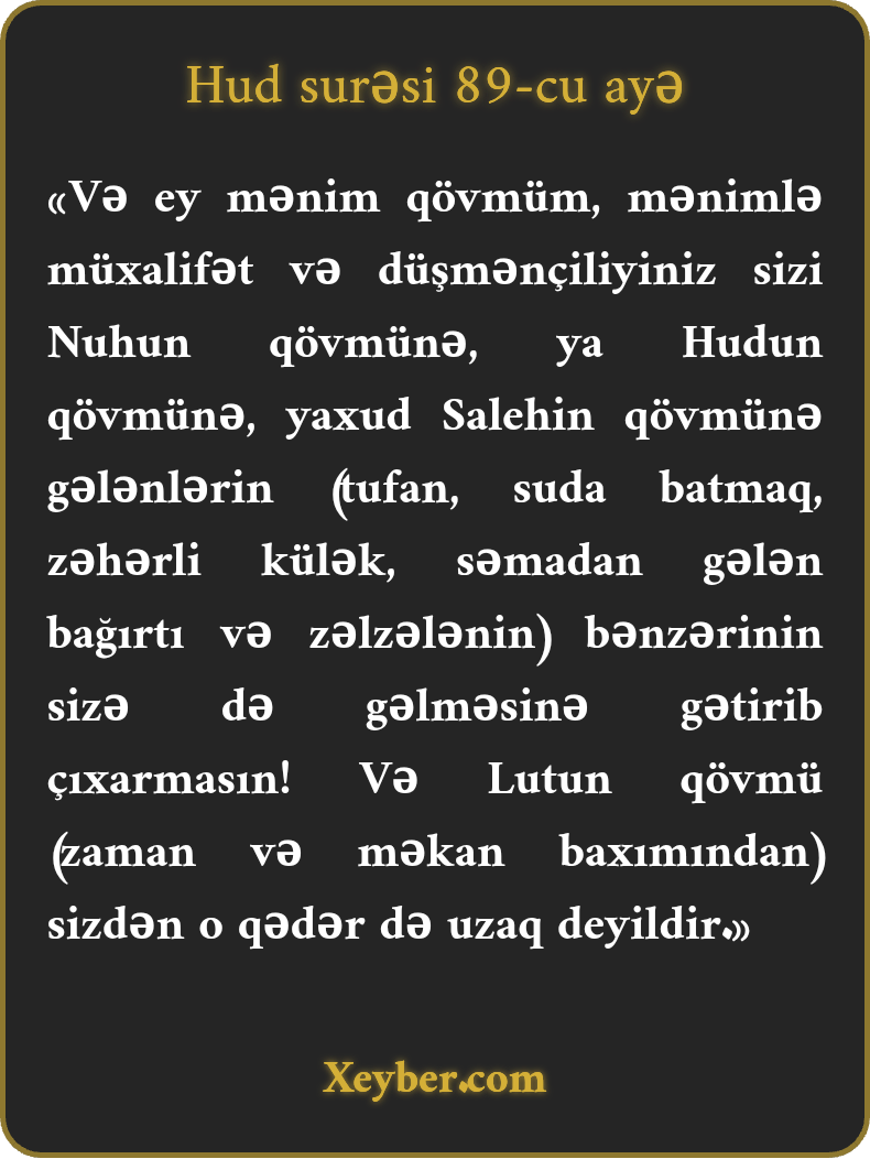 sizi o işlərə sövq etməsin ki, Nuh, Hud, Saleh qövmü kimi (əzaba) düçar