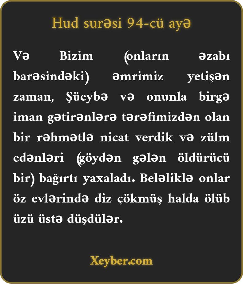 “Elə ki, (qəhr-qəzəb) fərmanımız gəldi, Şüeyb və onunla iman gətirənləri