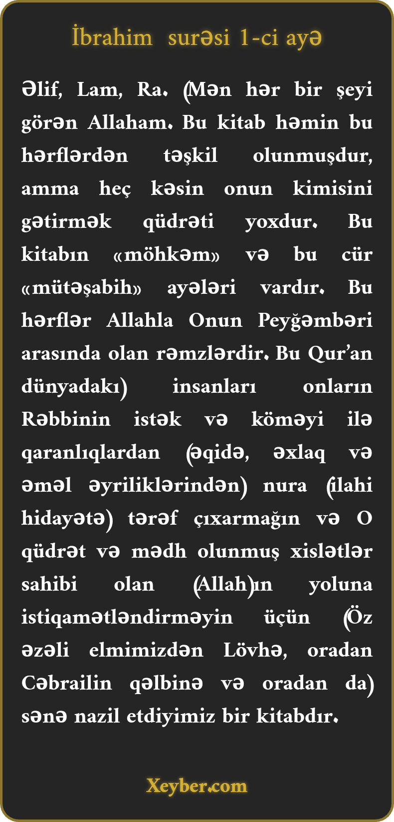 "Əlif, lam, ra. (Bu,) xalqı Rəbbinin izni ilə zülmətlərdən nura, qüvvət sahibi olan, həmd-sənaya layiq Allaha doğru yönəltməyin üçün sənə nazil etdiyimiz bir kitabdır.”
