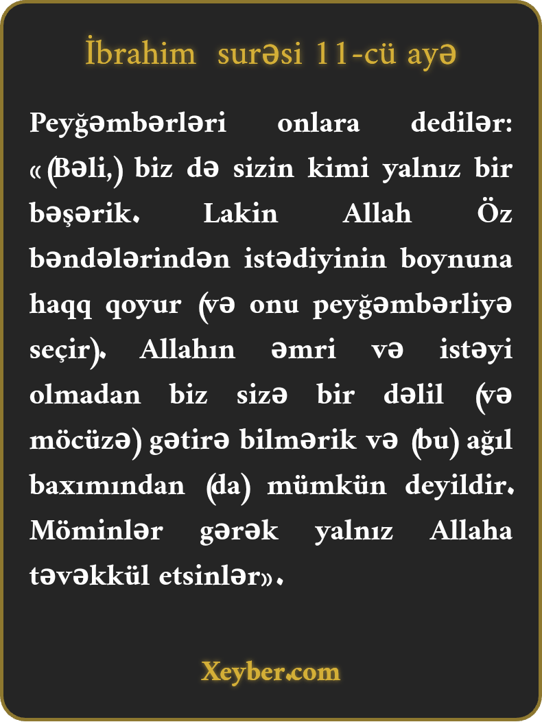"Peyğəmbərləri onlara cavab olaraq dedilər: "(Bəli,) biz sizdən fərqli bəşər deyilik. Amma Allah Öz bəndələrindən istədiyinə minnət qoyur (və onu peyğəmbər seçir). Allahın izni olmadan sizə möcüzə gətirmək bizim işimiz deyil. Belə isə, möminlər yalnız Allaha təvəkkül etməlidirlər.”