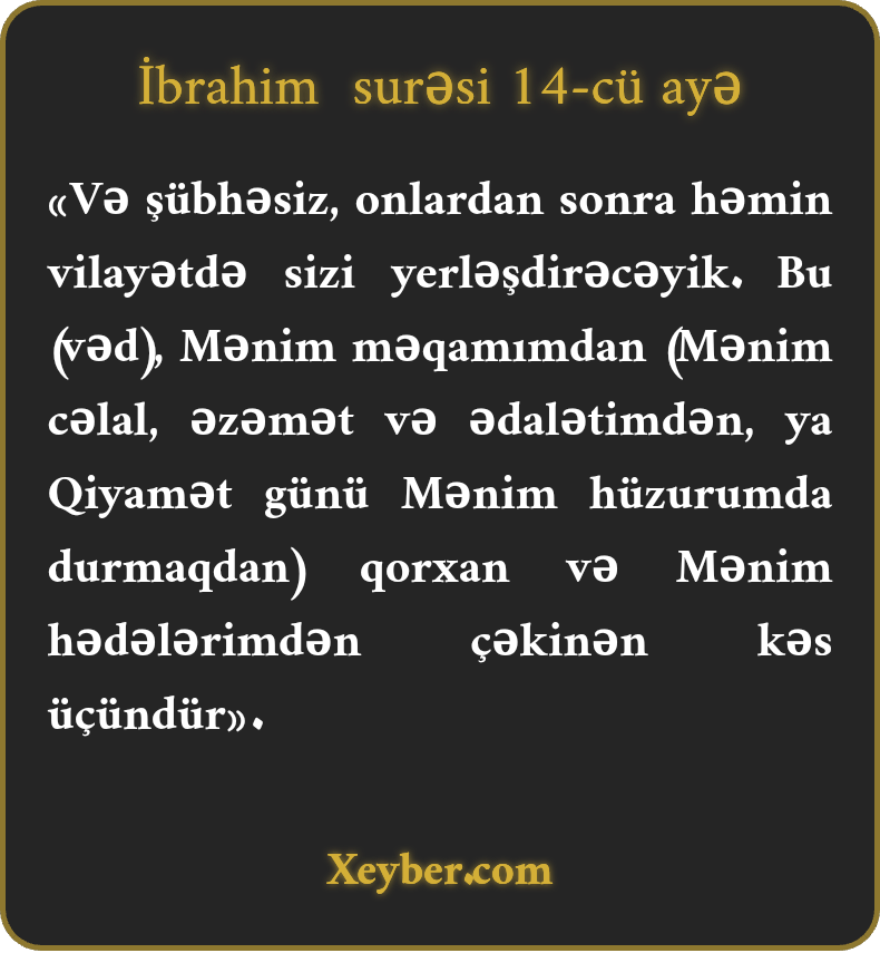 "Həqiqətən, sitəmkarlardan (onların həlakından) sonra sizi həmin torpaqda sakin edəcəyik. Bu Mənim məqamımdan çəkinən, vədimdən qorxanlar üçündür.”
