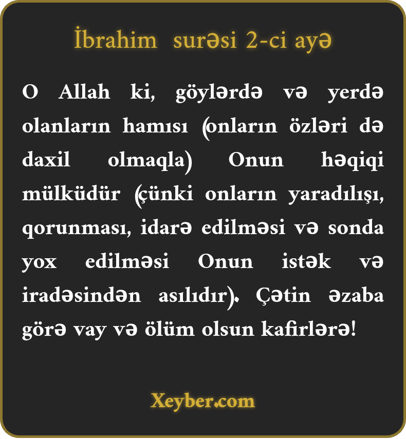 "Bir Allah ki, göylərdə və yerdə olan Onundur. Şiddətli əzaba görə vay kafirlərin halına!”