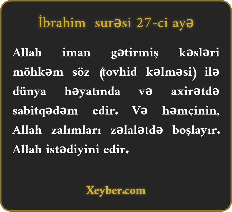 "Allah dünya və axirətdə iman əhlini sabit sözlə (əqidə ilə) möhkəmləndirər. Allah sitəmkarları (lütfündən məhrum edib özbaşına buraxar,) azdırar. Allah (ədalət və hikmət əsasında) istədiyini edər.”