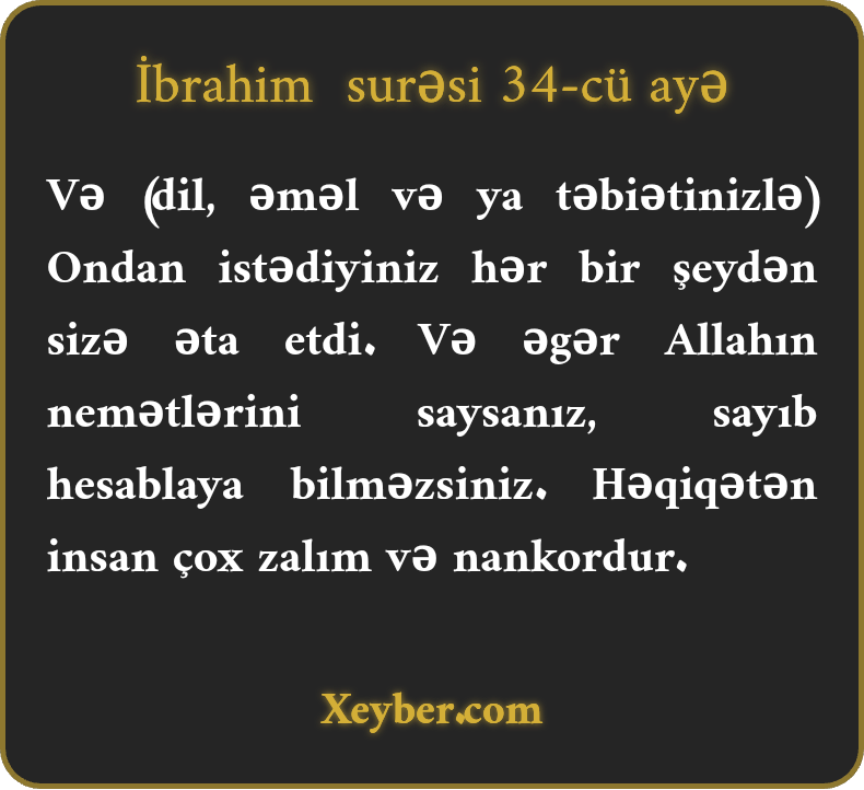 "Allah Ondan istədiyiniz hər şeyi vermişdir. Allahın nemətlərini saysanız, onları diqqətlə hesaba ala bilməzsiniz. Həqiqətən, insan çox sitəmkar və nankordur.”