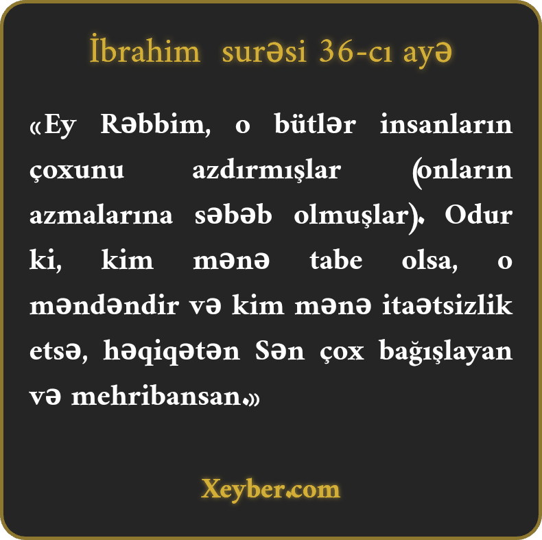 "Pərvərdigara! Həqiqətən, bütlər insanların çoxunu azdırmışdır. Mənə itaət edən, şübhəsiz, məndəndir. Mənə müxalif olan (bilsin ki, tövbə etsə) həqiqətən, Sən bağışlayan və mehribansan.”