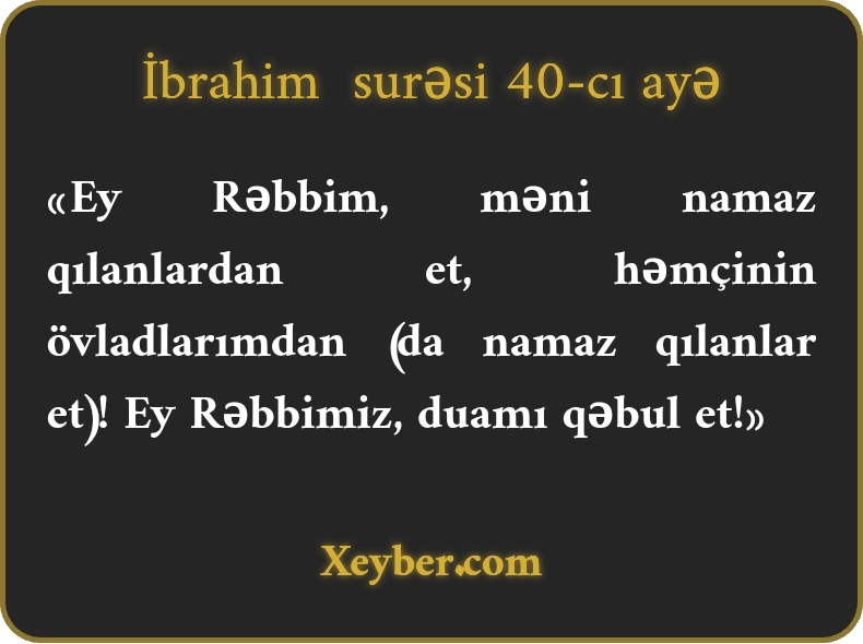 "Pərvərdigara! Məni və nəslimdən olanları namazı bərpa edənlərdən qərar ver. Pərvərdigara! Mənim duamı qəbul et.”