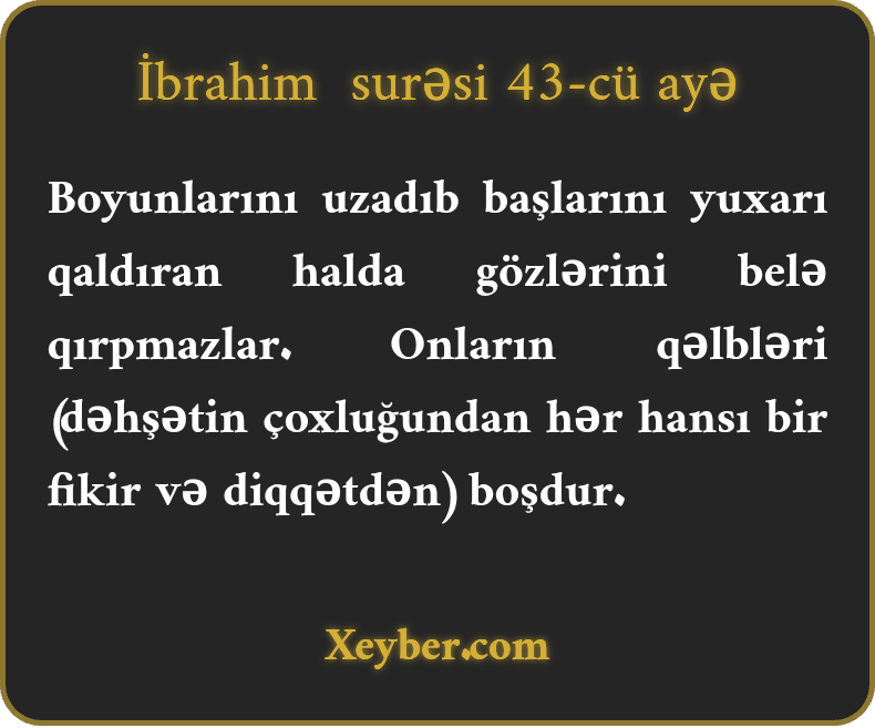 "(Elə bir gün ki, günahkarlar dəhşətdən) başlarını qaldırıb durar, gözlərini qırpa bilməzlər. Onların qəlbi boşdur (ümidsizdirlər).”