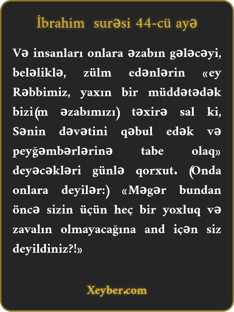 «Xalqı əzab soraqlarına gələcək günlə qorxut. Zülm edənlər deyəcək: "Pərvərdigara! Bizə qısa bir müddət möhlət ver ki, dəvətini qəbul edək, peyğəmbərlərinə tabe olaq.” (Onlara deyilər:) Bundan öncə and içib zavala gəlməyəcəyini deyən siz deyildinizmi?»