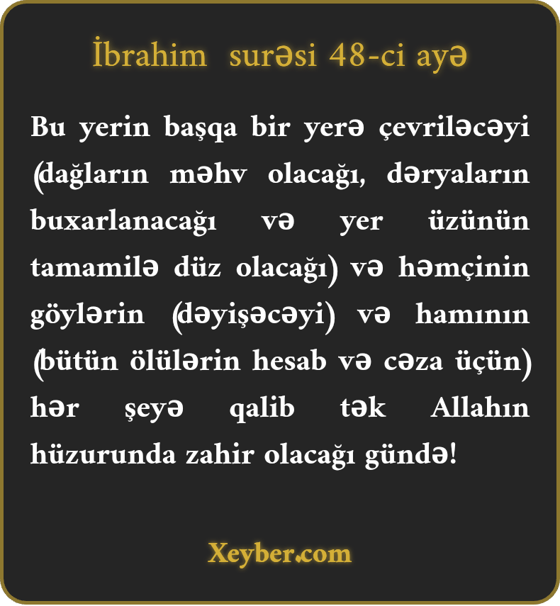 "(Qiyamət) Elə bir gündür ki, yer başqa bir yerlə, səmalar başqa səmalarla əvəz olar və hamı yeganə, qalib Allahın hüzurunda dayanar.”