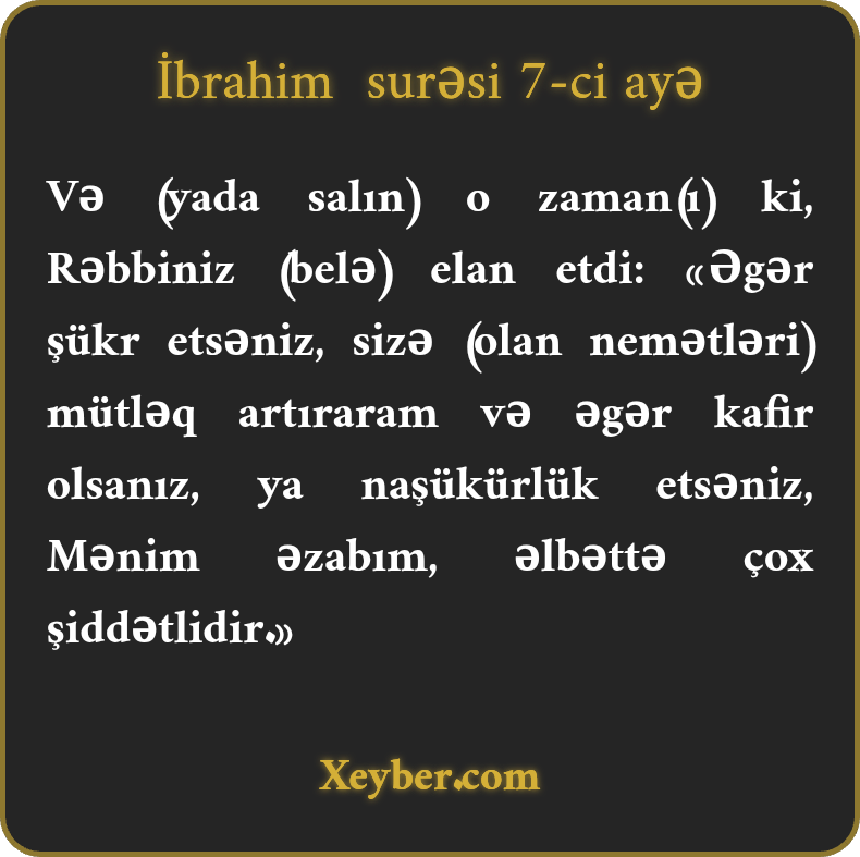 "(Xatırla) o zaman ki, Rəbbiniz elan etdi: Həqiqətən, əgər şükür etsəniz, hökmən sizin üçün artırarıq. Əgər nankorluq etsəniz, həqiqətən, Mənim əzabım ağırdır.”