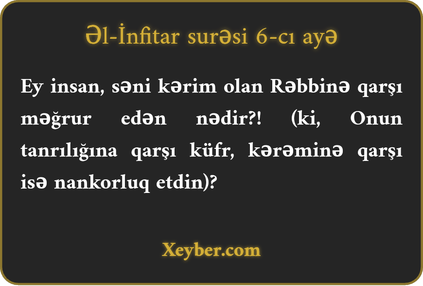 Ey insan, səni kərim olan Rəbbinə qarşı məğrur edən nədir?! (ki, Onun tanrılığına qarşı küfr, kərəminə qarşı isə nankorluq etdin)?