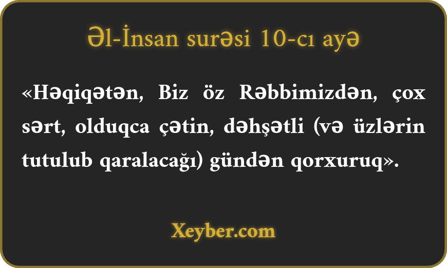 «Həqiqətən, Biz öz Rəbbimizdən, çox sərt, olduqca çətin, dəhşətli (və üzlərin tutulub qaralacağı) gündən qorxuruq».