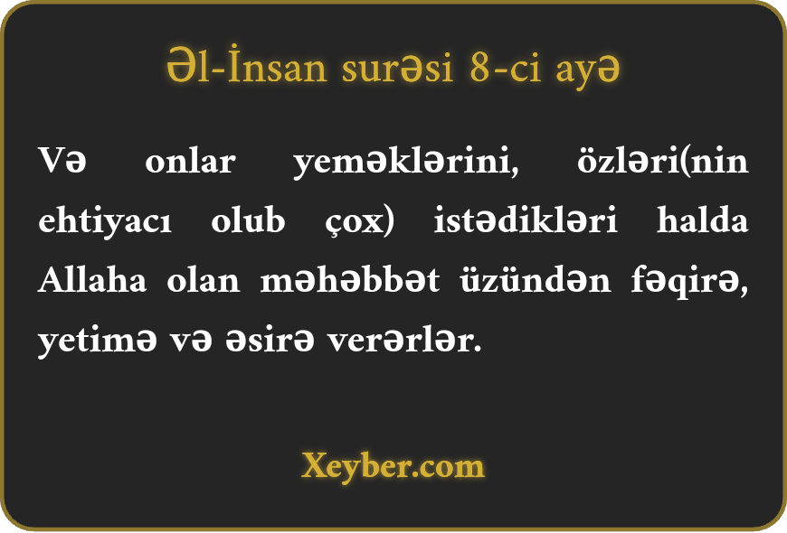 Və onlar yeməklərini, özləri(nin ehtiyacı olub çox) istədikləri halda Allaha olan məhəbbət üzündən fəqirə, yetimə və əsirə verərlər.