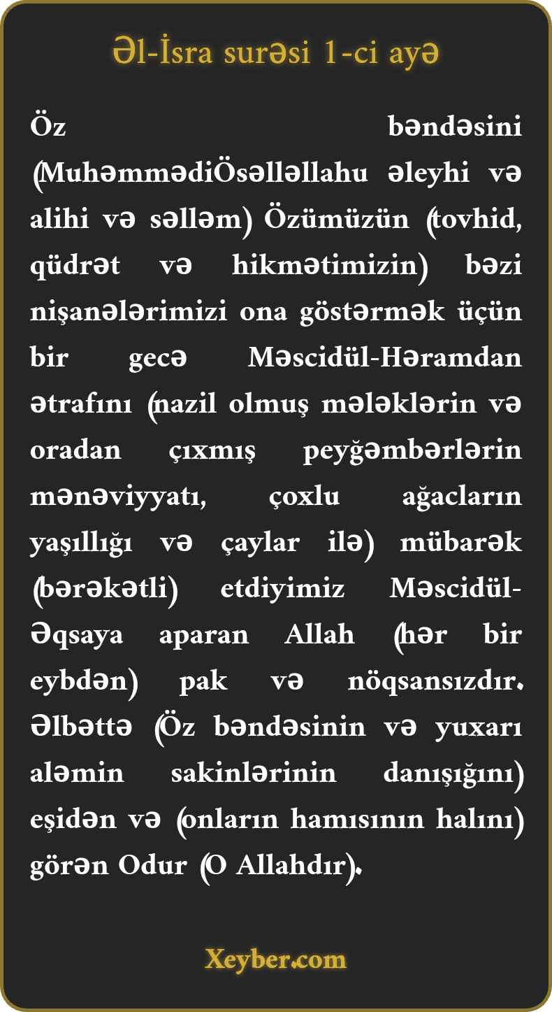 Öz bəndəsini (MuhəmmədiÖsəlləllahu əleyhi və alihi və səlləm) Özümüzün (tovhid, qüdrət və hikmətimizin) bəzi nişanələrimizi ona göstərmək üçün bir gecə Məscidül-Həramdan ətrafını (nazil olmuş mələklərin və oradan çıxmış peyğəmbərlərin mənəviyyatı, çoxlu ağacların yaşıllığı və çaylar ilə) mübarək (bərəkətli) etdiyimiz Məscidül-Əqsaya aparan Allah (hər bir eybdən) pak və nöqsansızdır. Əlbəttə (Öz bəndəsinin və yuxarı aləmin sakinlərinin danışığını) eşidən və (onların hamısının halını) görən Odur (O Allahdır).