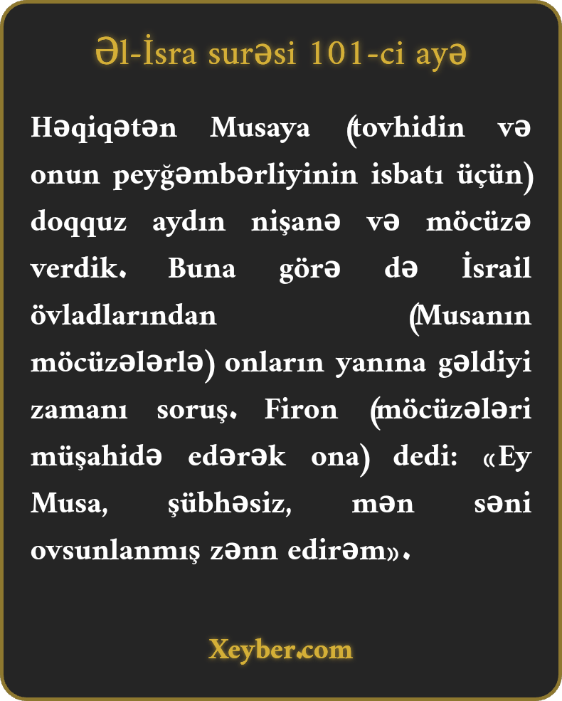 Həqiqətən Musaya (tovhidin və onun peyğəmbərliyinin isbatı üçün) doqquz aydın nişanə və möcüzə verdik. Buna görə də İsrail övladlarından (Musanın möcüzələrlə) onların yanına gəldiyi zamanı soruş. Firon (möcüzələri müşahidə edərək ona) dedi: «Ey Musa, şübhəsiz, mən səni ovsunlanmış zənn edirəm».