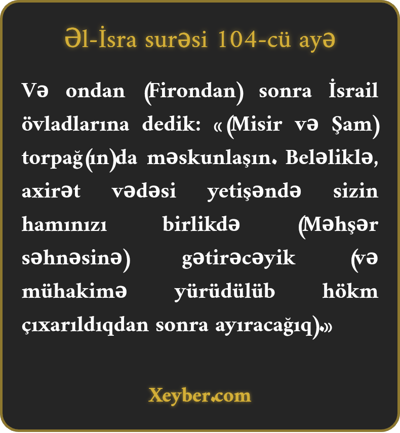 Və ondan (Firondan) sonra İsrail övladlarına dedik: «(Misir və Şam) torpağ(ın)da məskunlaşın. Beləliklə, axirət vədəsi yetişəndə sizin hamınızı birlikdə (Məhşər səhnəsinə) gətirəcəyik (və mühakimə yürüdülüb hökm çıxarıldıqdan sonra ayıracağıq).»