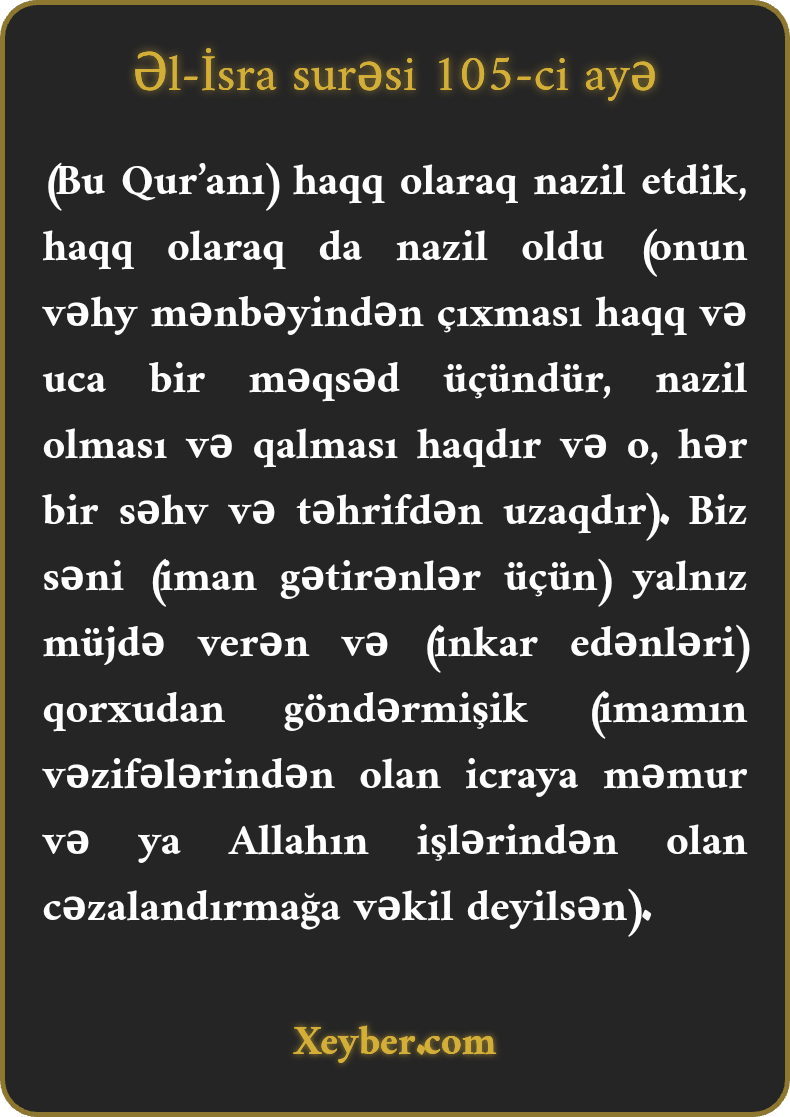 (Bu Qur’anı) haqq olaraq nazil etdik, haqq olaraq da nazil oldu (onun vəhy mənbəyindən çıxması haqq və uca bir məqsəd üçündür, nazil olması və qalması haqdır və o, hər bir səhv və təhrifdən uzaqdır). Biz səni (iman gətirənlər üçün) yalnız müjdə verən və (inkar edənləri) qorxudan göndərmişik (imamın vəzifələrindən olan icraya məmur və ya Allahın işlərindən olan cəzalandırmağa vəkil deyilsən).