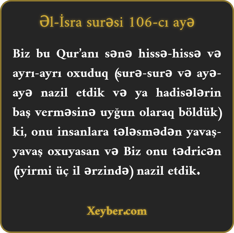 Biz bu Qur’anı sənə hissə-hissə və ayrı-ayrı oxuduq (surə-surə və ayə-ayə nazil etdik və ya hadisələrin baş verməsinə uyğun olaraq böldük) ki, onu insanlara tələsmədən yavaş-yavaş oxuyasan və Biz onu tədricən (iyirmi üç il ərzində) nazil etdik.