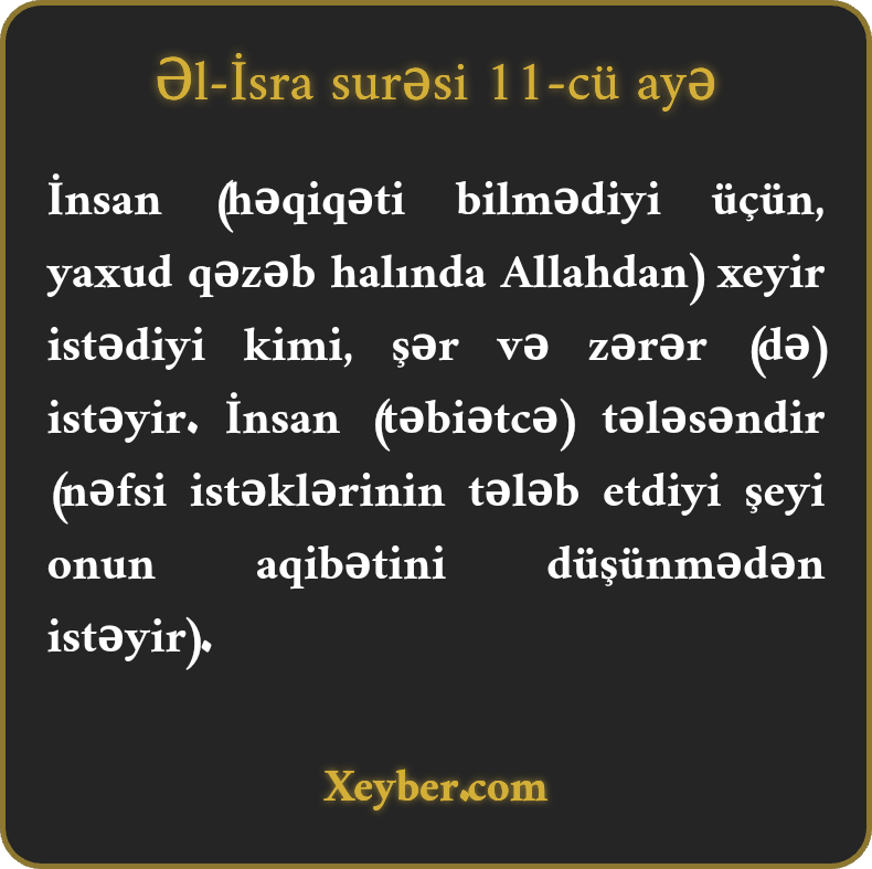 İnsan (həqiqəti bilmədiyi üçün, yaxud qəzəb halında Allahdan) xeyir istədiyi kimi, şər və zərər (də) istəyir. İnsan (təbiətcə) tələsəndir (nəfsi istəklərinin tələb etdiyi şeyi onun aqibətini düşünmədən istəyir).