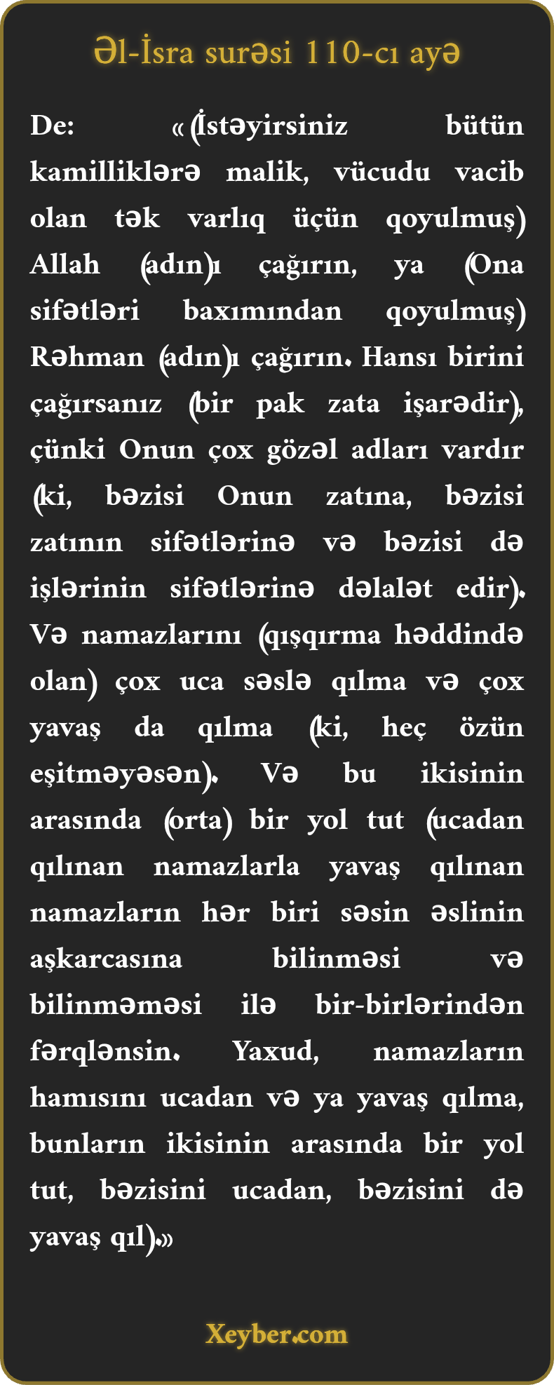 De: «(İstəyirsiniz bütün kamilliklərə malik, vücudu vacib olan tək varlıq üçün qoyulmuş) Allah (adın)ı çağırın, ya (Ona sifətləri baxımından qoyulmuş) Rəhman (adın)ı çağırın. Hansı birini çağırsanız (bir pak zata işarədir), çünki Onun çox gözəl adları vardır (ki, bəzisi Onun zatına, bəzisi zatının sifətlərinə və bəzisi də işlərinin sifətlərinə dəlalət edir). Və namazlarını (qışqırma həddində olan) çox uca səslə qılma və çox yavaş da qılma (ki, heç özün eşitməyəsən). Və bu ikisinin arasında (orta) bir yol tut (ucadan qılınan namazlarla yavaş qılınan namazların hər biri səsin əslinin aşkarcasına bilinməsi və bilinməməsi ilə bir-birlərindən fərqlənsin. Yaxud, namazların hamısını ucadan və ya yavaş qılma, bunların ikisinin arasında bir yol tut, bəzisini ucadan, bəzisini də yavaş qıl).»