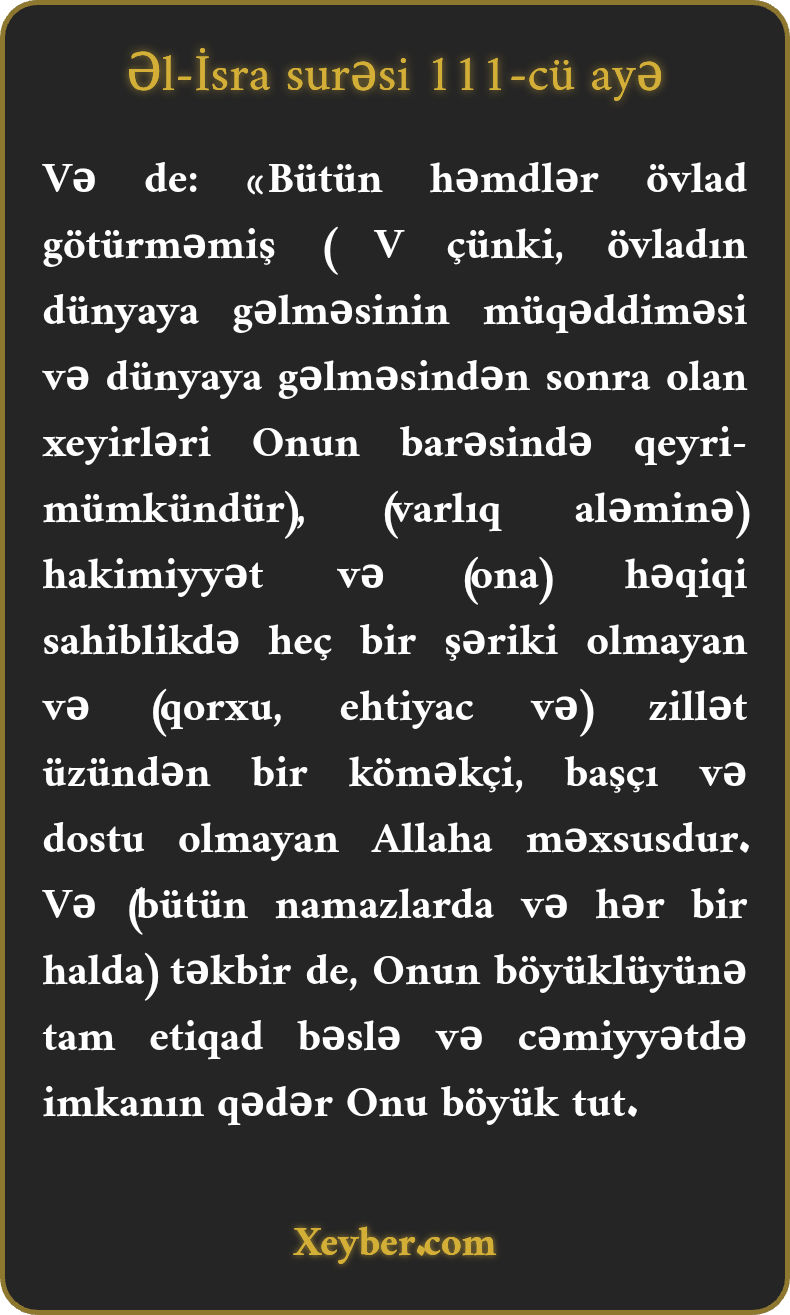Və de: «Bütün həmdlər övlad götürməmiş ( V çünki, övladın dünyaya gəlməsinin müqəddiməsi və dünyaya gəlməsindən sonra olan xeyirləri Onun barəsində qeyri-mümkündür), (varlıq aləminə) hakimiyyət və (ona) həqiqi sahiblikdə heç bir şəriki olmayan və (qorxu, ehtiyac və) zillət üzündən bir köməkçi, başçı və dostu olmayan Allaha məxsusdur. Və (bütün namazlarda və hər bir halda) təkbir de, Onun böyüklüyünə tam etiqad bəslə və cəmiyyətdə imkanın qədər Onu böyük tut.