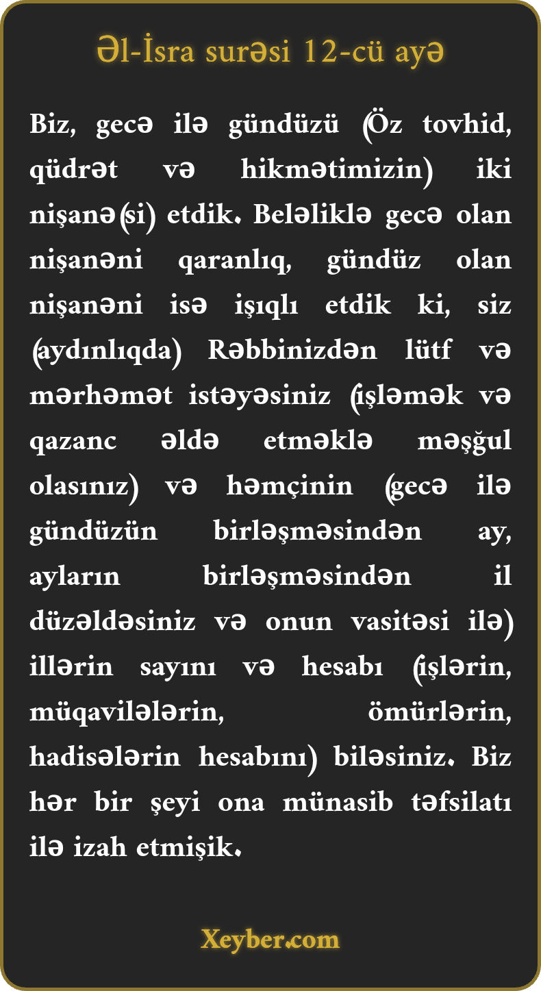 Biz, gecə ilə gündüzü (Öz tovhid, qüdrət və hikmətimizin) iki nişanə(si) etdik. Beləliklə gecə olan nişanəni qaranlıq, gündüz olan nişanəni isə işıqlı etdik ki, siz (aydınlıqda) Rəbbinizdən lütf və mərhəmət istəyəsiniz (işləmək və qazanc əldə etməklə məşğul olasınız) və həmçinin (gecə ilə gündüzün birləşməsindən ay, ayların birləşməsindən il düzəldəsiniz və onun vasitəsi ilə) illərin sayını və hesabı (işlərin, müqavilələrin, ömürlərin, hadisələrin hesabını) biləsiniz. Biz hər bir şeyi ona münasib təfsilatı ilə izah etmişik.