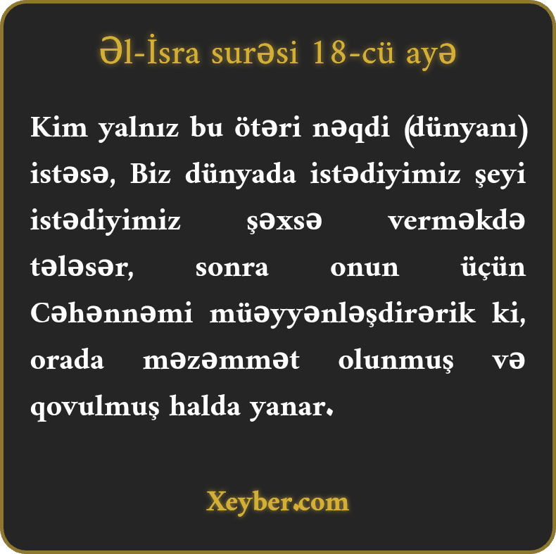 Kim yalnız bu ötəri nəqdi (dünyanı) istəsə, Biz dünyada istədiyimiz şeyi istədiyimiz şəxsə verməkdə tələsər, sonra onun üçün Cəhənnəmi müəyyənləşdirərik ki, orada məzəmmət olunmuş və qovulmuş halda yanar.