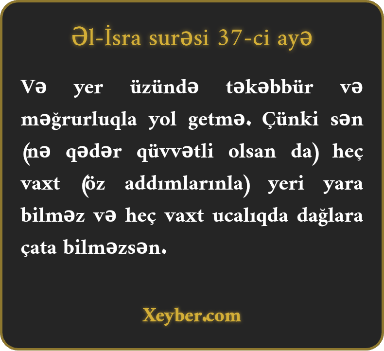 Və yer üzündə təkəbbür və məğrurluqla yol getmə. Çünki sən (nə qədər qüvvətli olsan da) heç vaxt (öz addımlarınla) yeri yara bilməz və heç vaxt ucalıqda dağlara çata bilməzsən.