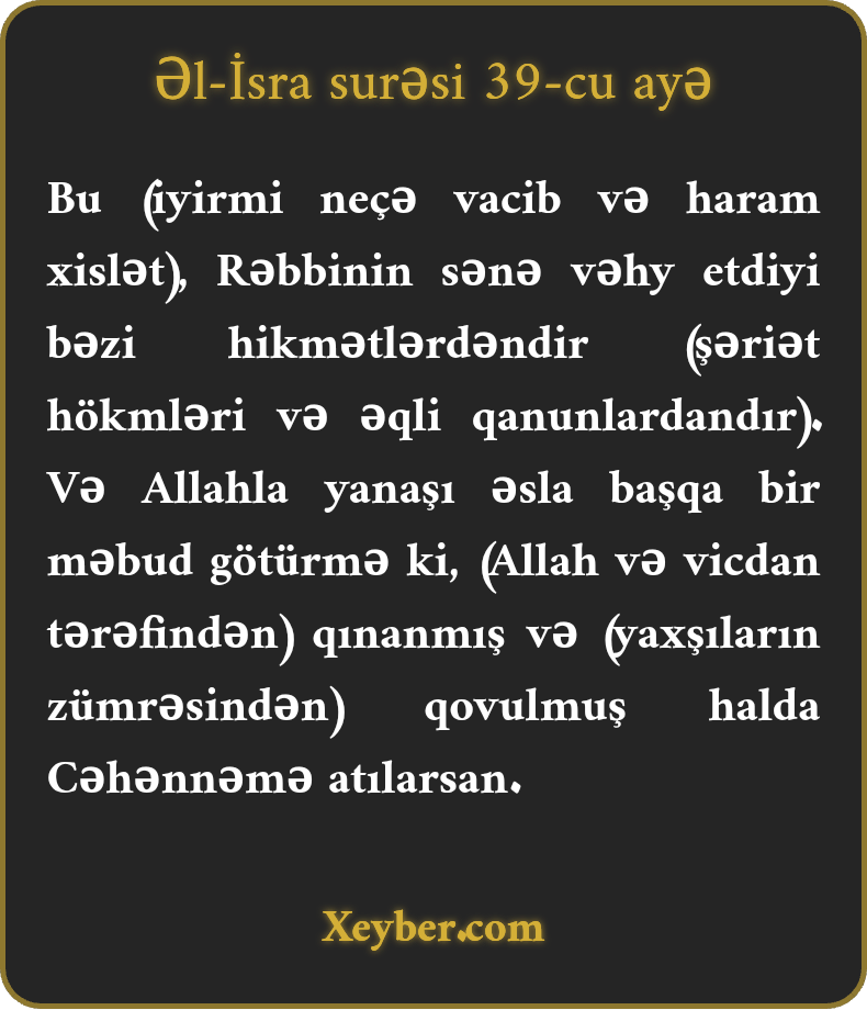 Bu (iyirmi neçə vacib və haram xislət), Rəbbinin sənə vəhy etdiyi bəzi hikmətlərdəndir (şəriət hökmləri və əqli qanunlardandır). Və Allahla yanaşı əsla başqa bir məbud götürmə ki, (Allah və vicdan tərəfindən) qınanmış və (yaxşıların zümrəsindən) qovulmuş halda Cəhənnəmə atılarsan.