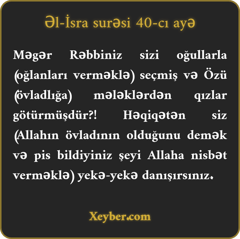 Məgər Rəbbiniz sizi oğullarla (oğlanları verməklə) seçmiş və Özü (övladlığa) mələklərdən qızlar götürmüşdür?! Həqiqətən siz (Allahın övladının olduğunu demək və pis bildiyiniz şeyi Allaha nisbət verməklə) yekə-yekə danışırsınız.