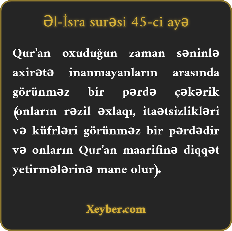 Qur’an oxuduğun zaman səninlə axirətə inanmayanların arasında görünməz bir pərdə çəkərik (onların rəzil əxlaqı, itaətsizlikləri və küfrləri görünməz bir pərdədir və onların Qur’an maarifinə diqqət yetirmələrinə mane olur).