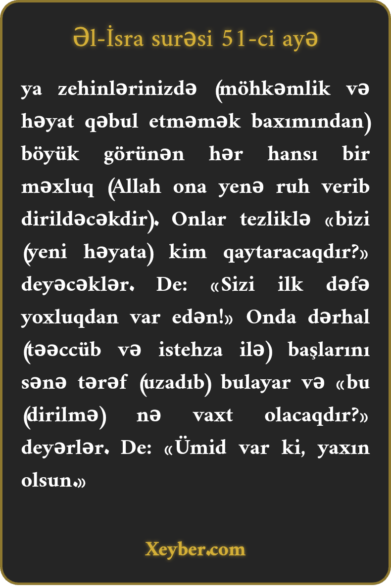 ya zehinlərinizdə (möhkəmlik və həyat qəbul etməmək baxımından) böyük görünən hər hansı bir məxluq (Allah ona yenə ruh verib dirildəcəkdir). Onlar tezliklə «bizi (yeni həyata) kim qaytaracaqdır?» deyəcəklər. De: «Sizi ilk dəfə yoxluqdan var edən!» Onda dərhal (təəccüb və istehza ilə) başlarını sənə tərəf (uzadıb) bulayar və «bu (dirilmə) nə vaxt olacaqdır?» deyərlər. De: «Ümid var ki, yaxın olsun.»