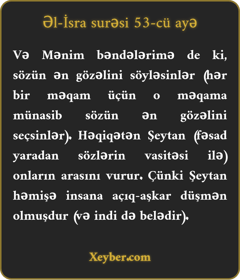 Və Mənim bəndələrimə de ki, sözün ən gözəlini söyləsinlər (hər bir məqam üçün o məqama münasib sözün ən gözəlini seçsinlər). Həqiqətən Şeytan (fəsad yaradan sözlərin vasitəsi ilə) onların arasını vurur. Çünki Şeytan həmişə insana açıq-aşkar düşmən olmuşdur (və indi də belədir).