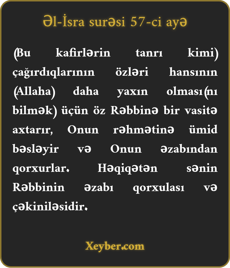 (Bu kafirlərin tanrı kimi) çağırdıqlarının özləri hansının (Allaha) daha yaxın olması(nı bilmək) üçün öz Rəbbinə bir vasitə axtarır, Onun rəhmətinə ümid bəsləyir və Onun əzabından qorxurlar. Həqiqətən sənin Rəbbinin əzabı qorxulası və çəkiniləsidir.