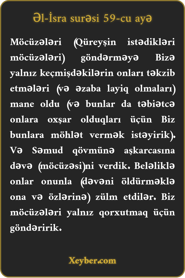 Möcüzələri (Qüreyşin istədikləri möcüzələri) göndərməyə Bizə yalnız keçmişdəkilərin onları təkzib etmələri (və əzaba layiq olmaları) mane oldu (və bunlar da təbiətcə onlara oxşar olduqları üçün Biz bunlara möhlət vermək istəyirik). Və Səmud qövmünə aşkarcasına dəvə (möcüzəsi)ni verdik. Beləliklə onlar onunla (dəvəni öldürməklə ona və özlərinə) zülm etdilər. Biz möcüzələri yalnız qorxutmaq üçün göndəririk.